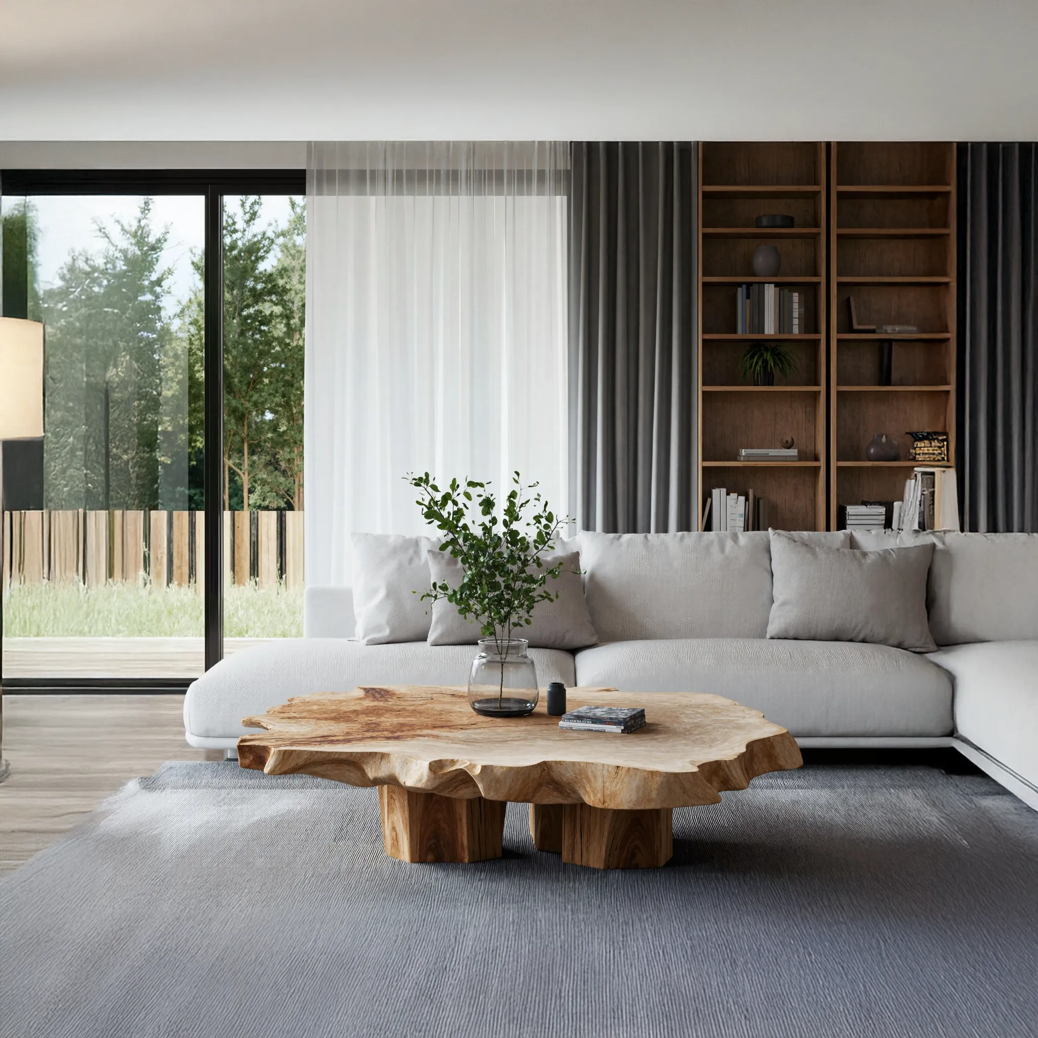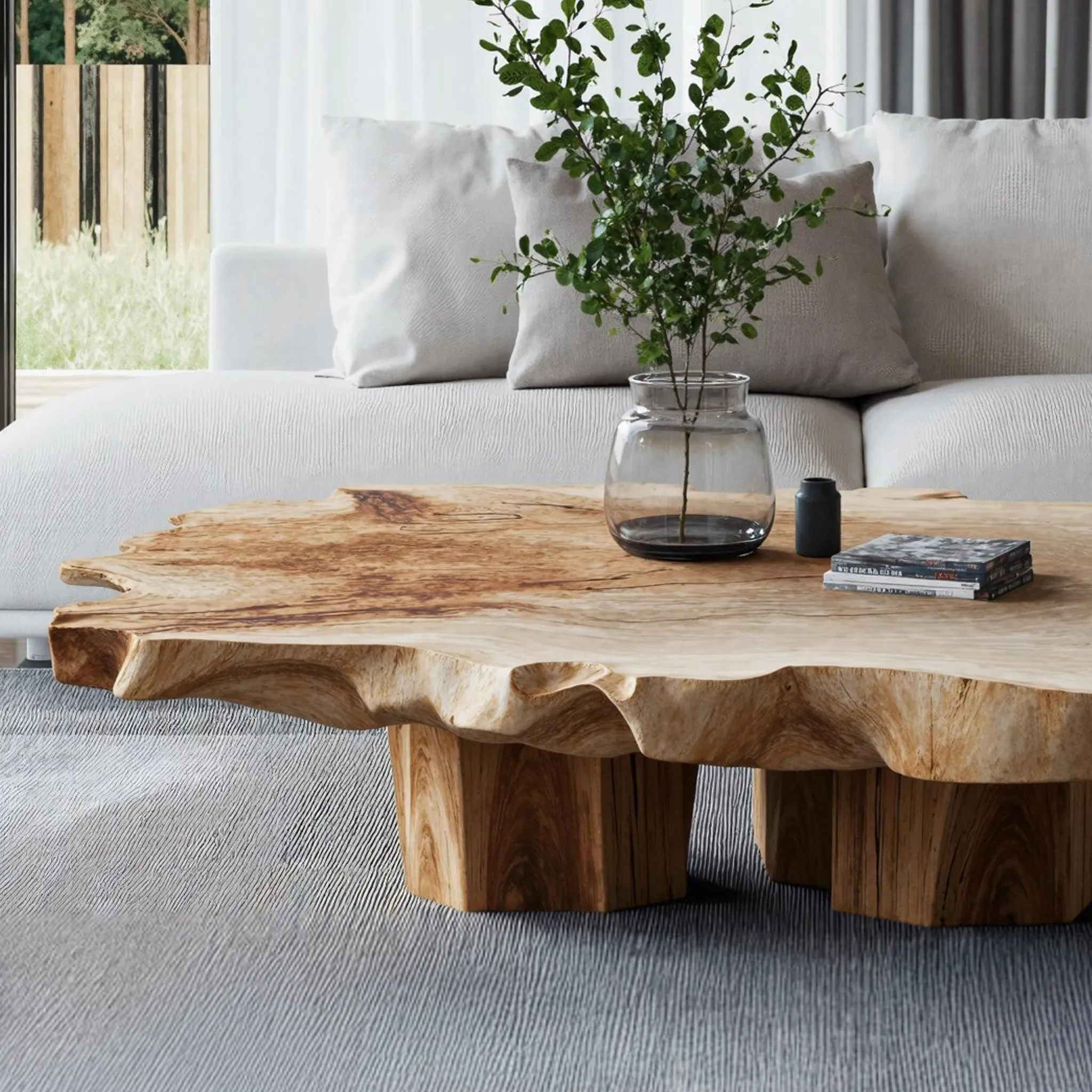 This handcrafted solid wood coffee table is created for artistic living rooms that value individuality and craftsmanship. The design highlights natural wood textures while maintaining a refined, balanced form.