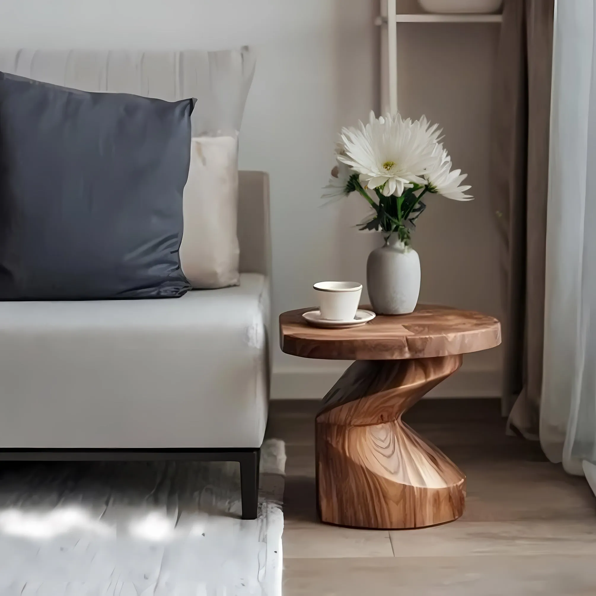 This design partners well with relaxed layouts. Place it beside a lounge chair to keep a cup and a book close while the swirling profile adds interest to the corner. Use it as a bedside companion in a spare bedroom where its sculpted look becomes a small focal point. Pair it with a simple sofa to create a composition that feels intentional yet easy. The winding line complements rounded lamps, soft cushions, and woven baskets.